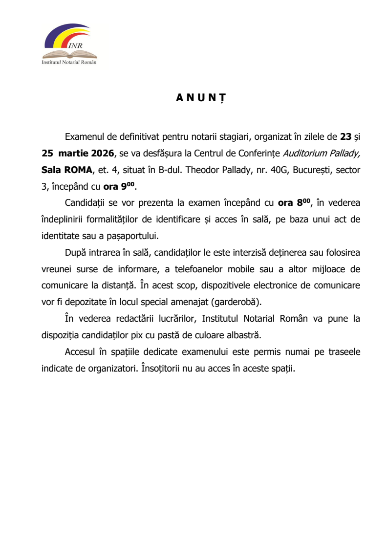 Anunț privind taxa și perioada de înscriere la examenul de definitivat, organizat în zilele de 24 și 26 februarie 2025 și lista posturilor vacante de notar public destinate notarilor stagiari care vor promova examenul de definitivat pentru anul 2024